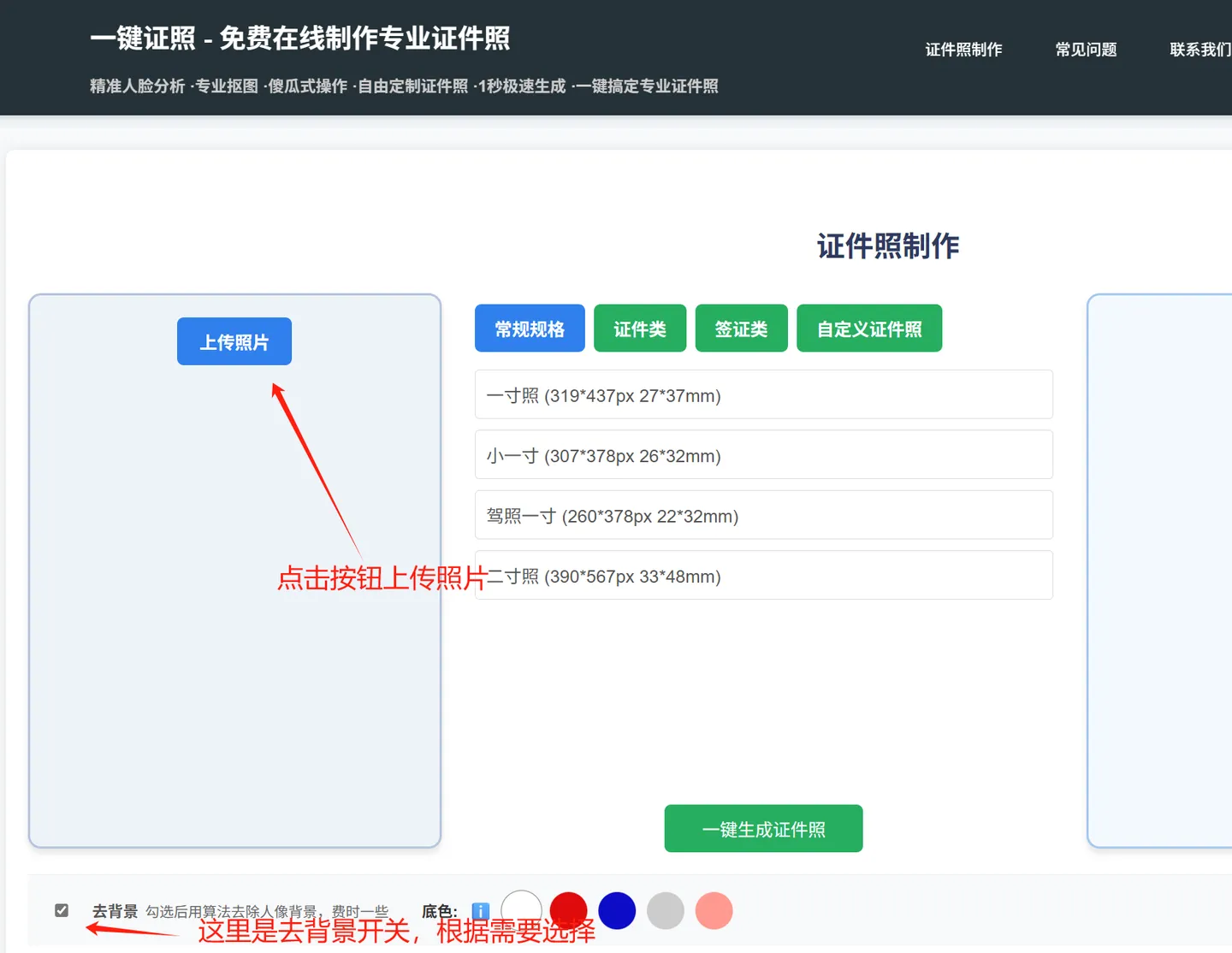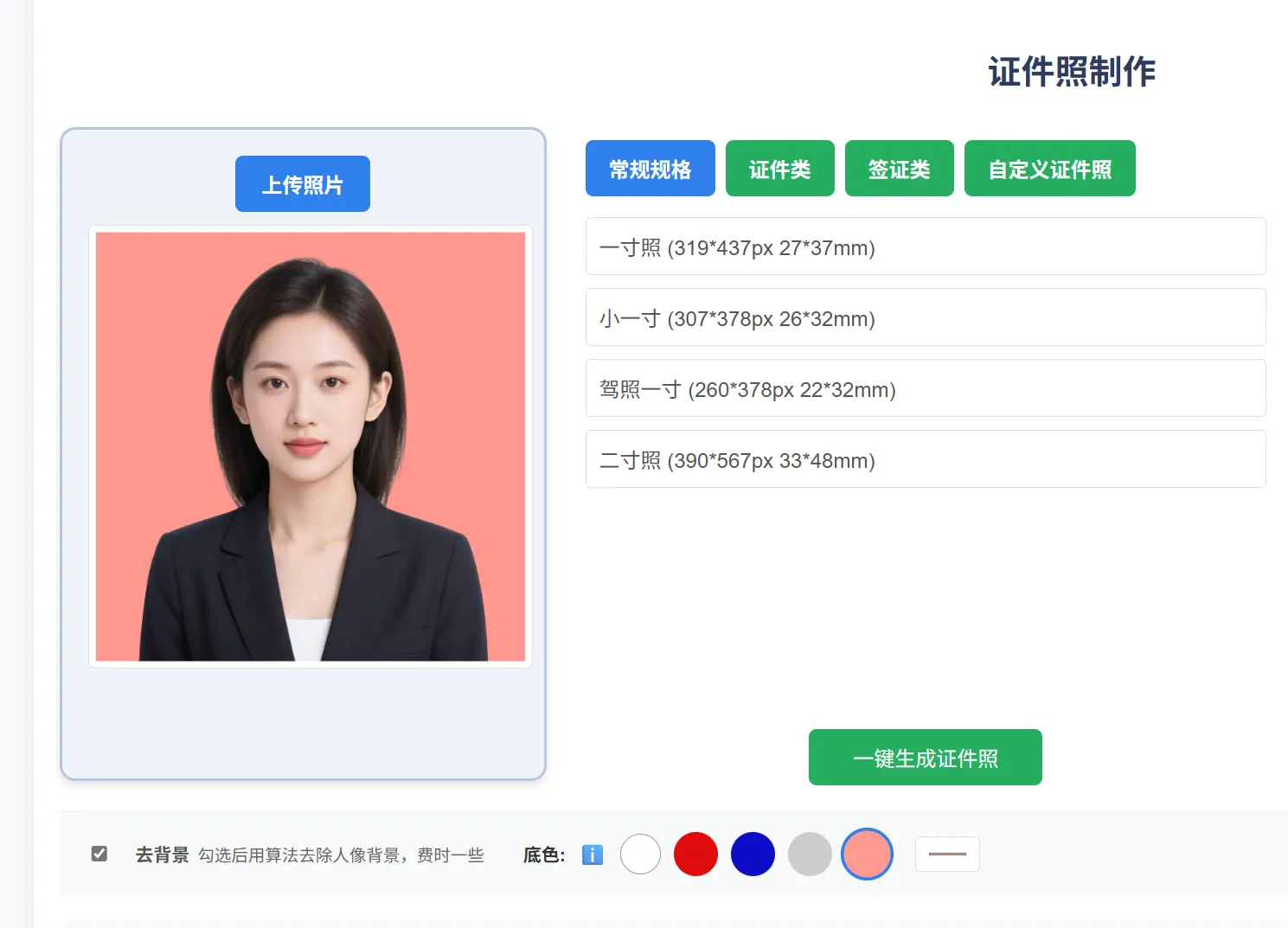 上传照片首先进行预处理,等待几秒后去背景处理完成,就可以选择您照片的底色了,然后选择照片规格或设置自定义证件照尺寸,最后一键生成您需要的证件照!